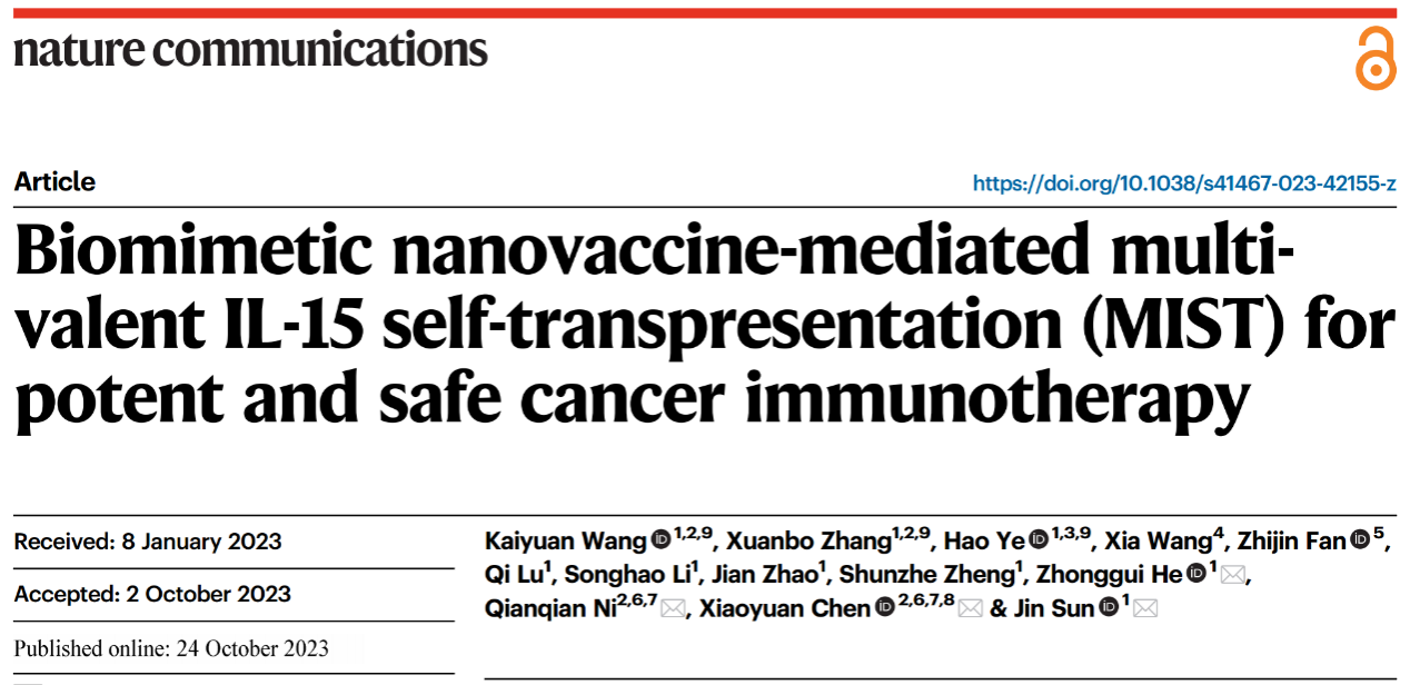2023年10月24日,必威西汉姆联孙进教授、何仲贵教授与新加坡国立大学陈小元教授、倪倩倩助理教授合作在Nature Communications杂志在线发表题为“Biomimetic nanovaccine-mediated multivalent IL-15 self-transpresentation (MIST) for potent and safe cancer immunotherapy”的研究论文,开发了仿生纳米疫苗介导多价IL-15自反式呈递,实现了IL-15和肿瘤抗原的时空同步递送,从而有效产生肿瘤特异性细胞毒性T淋巴细胞,用于有效且安全的肿瘤免疫治疗。