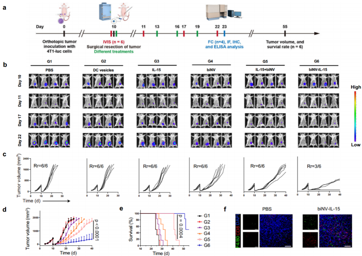 在体内抗肿瘤研究中,biNV-IL-15表现出了抗原特异性的抗肿瘤功效,在术后模型中展现出了高效的复发抑制作用(图5),并在肿瘤转移模型中有效阻断了肿瘤细胞对肺脏和肝脏的侵袭(图6)。