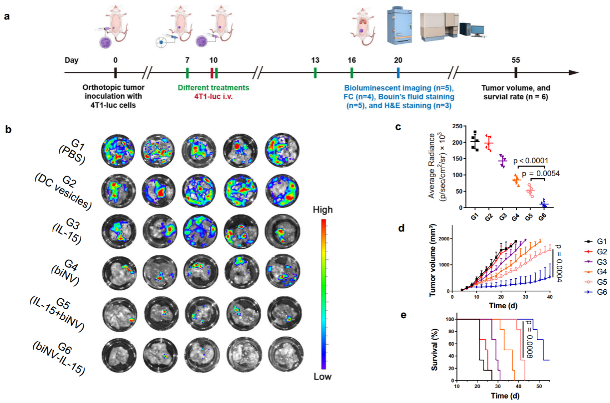 接下来作者考察了biNV-IL-15的体内毒性。将IL-15和biNV-IL-15给予小鼠,在单次治疗剂量超过7.5 μg的情况下四次注射IL-15后观察到显著的体重减轻,最终引起致死的免疫毒性。相比之下,即使在最大可用注射剂量下,biNV-IL-15的治疗也没有出现明显的毒性(图4)。IL-15和肿瘤抗原的时空同步呈递阻止了非特异性全身免疫刺激,从而避免了系统毒副作用。