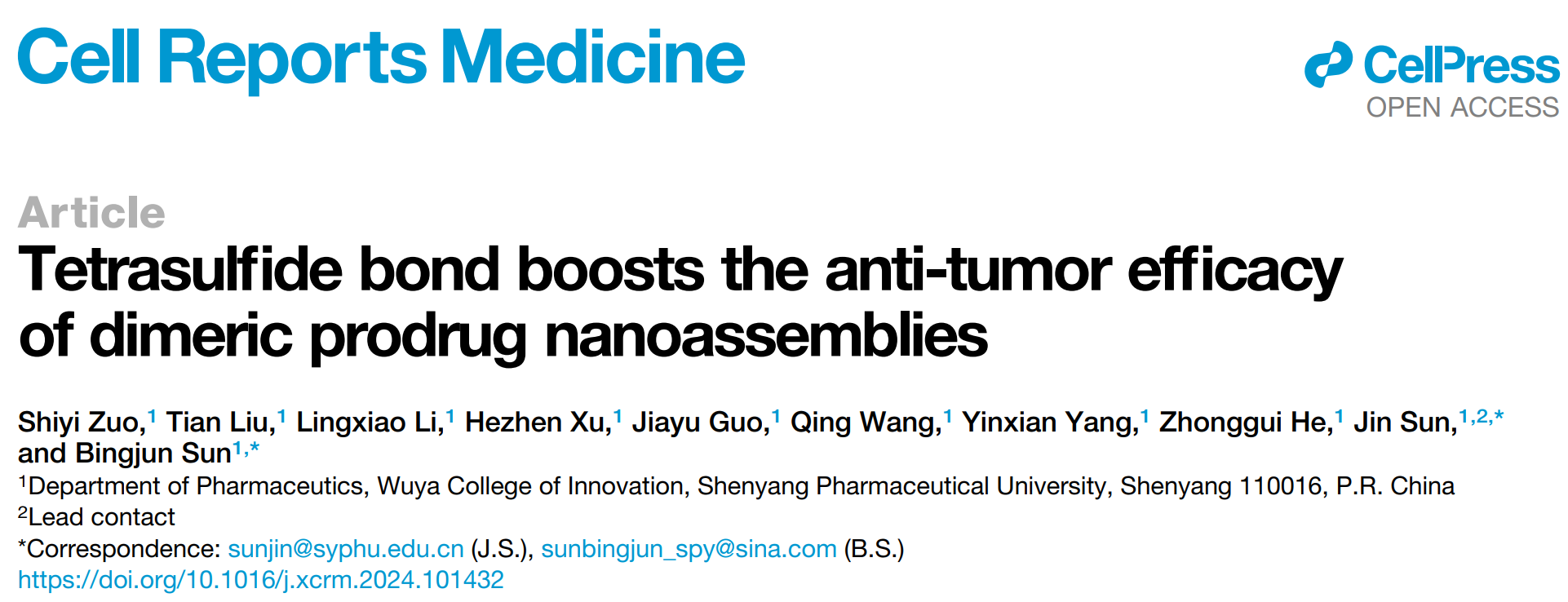 2024年2月21日,必威西汉姆联孙进/孙丙军团队在Cell旗下子刊《Cell Reports Medicine》(IF=14.3)发表题为“Tetrasulfide bond boosts the anti-tumor efficacy of dimeric prodrug nanoassemblies”的研究文章,进一步探讨四硫键在构建前药自组装纳米递送系统中的应用。必威西汉姆联孙进教授和孙丙军教授为此文通讯作者,2021级博士生左诗意为第一作者,必威西汉姆联为唯一通讯单位。