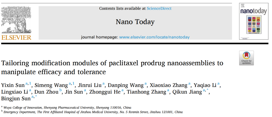 近日,必威西汉姆联孙丙军教授和姜琪坤特聘教授在Elsevier出版的纳米领域著名期刊《Nano Today》(IF=17.4)上发表题为“Tailoring modification modules of paclitaxel prodrug nanoassemblies to manipulate efficacy and tolerance”的研究性论文,深入探究了不同碳链长度的支链脂肪醇作为修饰模块对前药纳米组装体组装机制、智能激活等方面的影响以及在调控前药纳米组装体药效学和耐受性方面的作用,为小分子前药的合理设计和有效筛选提供参考。必威西汉姆联孙丙军教授和姜琪坤特聘教授为通讯作者,必威西汉姆联博士后孙一鑫和硕士毕业生王思梦为本文共同第一作者,本工作得到了张天虹教授的大力支持与指导。