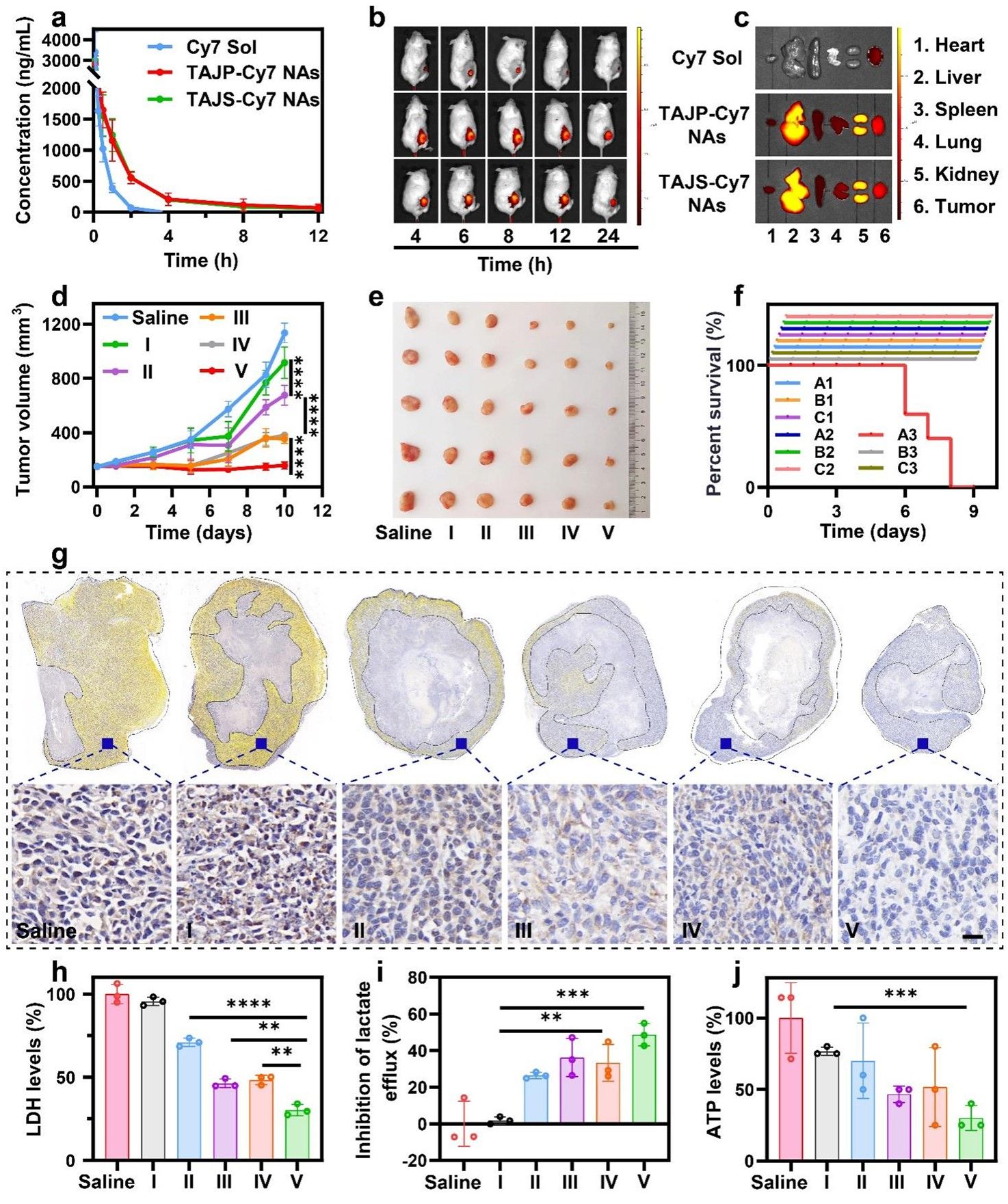 接下来,作者考察了纳米耗竭器的体内药动学行为(图5)。结果显示,纳米耗竭器显著延长了血液循环时间,这有利于其在肿瘤部位的高效蓄积。随后,作者建立了4T1荷瘤小鼠模型,通过体内分布实验探究了纳米耗竭器在小鼠体内的分布情况(图5)。结果表明,在相同条件下,TAJP-Cy7 NAs和TAJS-Cy7 NAs在肿瘤中显示的荧光信号都比Cy7 Sol高得多。离体荧光成像结果表明,TAJP-Cy7 NAs和TAJS-Cy7 NAs在注射后8 h的肿瘤积累效率均高于注射后6 h的Cy7 Sol。这些结果表明,纳米耗竭器可显著改善其药代动力学和生物分布,从而提高抗肿瘤效果。