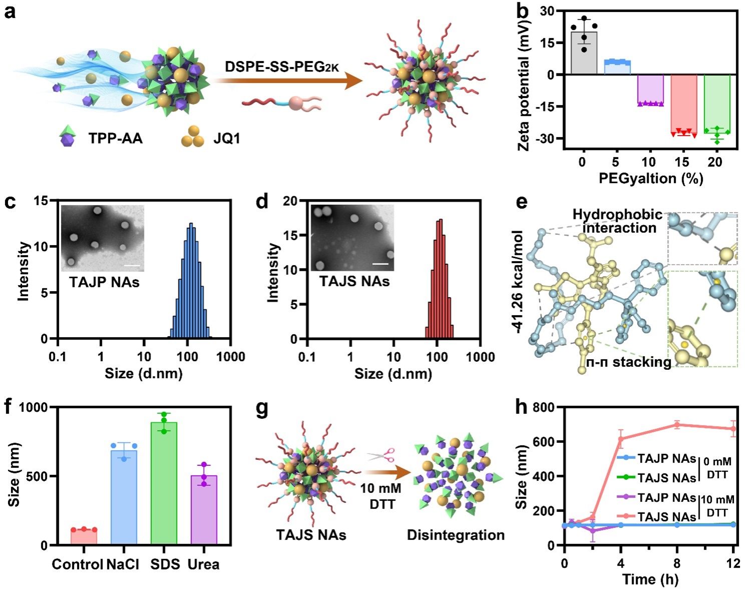 采用一步纳米沉淀法,TPP-AA和JQ1能够在没有任何载体材料的帮助下,以1:5至5:1的摩尔比进行共组装(图3)。综合考虑组装性能和协同细胞毒性,以TPP-AA/JQ1的摩尔比为1:3制备双向能量耗竭器。为了改善药代动力学和促进肿瘤特异性药物释放,采用二硫键桥接DSPE-SS-PEG2K作为表面修饰剂制备了还原响应型双向能量纳米耗竭器(TAJS NAs)。此外,以DSPE-PEG2K为修饰剂制备不具还原响应性的对照组(TAJP NAs)。结果表明,TAJP NAs和TAJS NAs具有非常相似的粒径分布(~100 nm)、Zeta电位和形态。此外,TAJP NAs和TAJS NAs在PBS(pH 7.4)、胎牛血清和血浆中均具有良好的稳定性。同样,4℃保存一周或冻干前后,粒径也没有明显变化。这些结果表明TAJP NAs和TAJS NAs具有优异的稳定性。随后,利用计算机分子对接技术及作用力破坏实验探讨了驱动TPP-AA/JQ1共组装的分子间作用力。结果表明,疏水相互作用、π-π堆叠、氢键和静电相互作用共同驱动了TAJ NAs的形成。此外,为了评估氧化还原刺激引发的TAJS NAs的解体行为,在二硫苏糖醇(DTT)存在下测定NAs(TAJP NAs和TAJS NAs)的粒径变化。结果表明,DSPE-SS-PEG2K修饰的TAJS NAs在氧化还原刺激下具有良好的解体特性。
