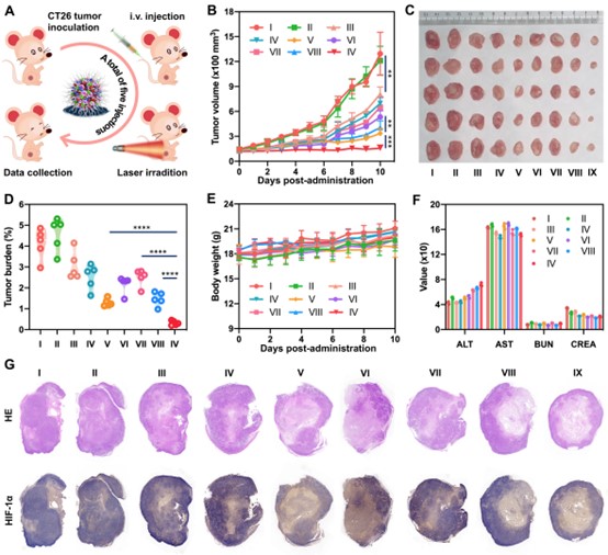 图7. 氧气纳米调节器在CT26荷瘤小鼠中的抗肿瘤作用。
