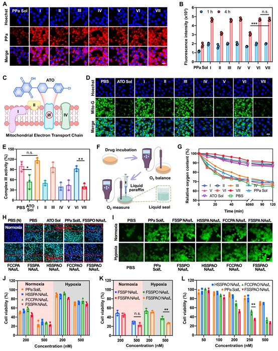 图4. 氧气纳米调节器的细胞摄取、机制探究和细胞毒性。