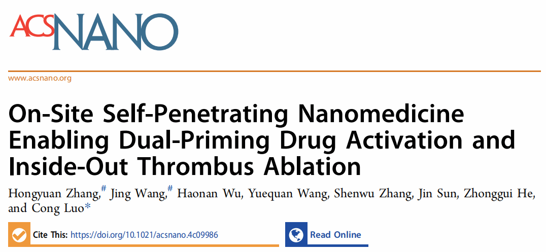 近日,必威西汉姆联罗聪教授团队在《ACS Nano》(IF=15.8)在线发表了最新研究成果“On-Site Self-Penetrating Nanomedicine Enabling Dual-Priming Drug Activation and Inside-Out Thrombus Ablation”。该研究提出了一种基于光热/光动双效光敏剂与氧化响应抗血小板前药共组装实现多模式激活抗血栓前药的新策略,有望解决血栓ROS异质性导致的前药激活瓶颈难题。在该研究中,作者首先设计合成了一种抗血小板药物替格瑞洛(TGL)的氧化响应前药(TGL-S-Fmoc, TSF)。随后,发现TSF可以与光热/光动双功能的光敏剂IR808共组装形成稳定的纳米结构。基于此,作者开发了一种自穿透、自激活、多模式协同的无载体纳米组装递药系统(T-TSFI NAs)。在光热效应的辅助下,T-TSFI NAs不仅能够实现血栓的深部穿透,还通过产生ROS协同内源性ROS触发前药按需激活,栓块内部释放抗血小板药物TGL,从而实现光热/抗血小板协同溶栓。T-TSFI NAs在FeCl₃诱导的大鼠颈动脉血栓模型中不仅有效抑制了血小板的激活和聚集,还显著降低了出血风险。这一策略成功克服了血栓微环境中ROS分布不均的难题,为抗血栓前药按需高效激活提供了新思路。