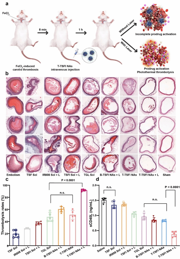 此外,进一步考察了T-TSFI NAs体内性质。首先,选取Sprague-Dawley(SD)大鼠作为动物模型考察了前药纳米组装体的药动学行为,结果表明,具有聚乙二醇修饰的前药纳米组装体T-TSFI NAs体内循环时间显著延长,明显优于无靶向修饰的前药纳米组装体B-TSFI NAs和溶液剂组。进一步,建立了三氯化铁(FeCl3)诱导的大鼠颈动脉栓塞动物模型,考察了T-TSFI NAs的靶向分布成像、体内升温、溶栓能力和体内抗血小板效果。结果表明,经过DSPE-PEG2k和DSPE-PEG2K-CREKA修饰后,并以IR808自身荧光实现荧光成像,能够实现血栓部位的靶向蓄积。在近红外光照射下,具有良好药动学行为的前药纳米组装体表现出病灶温度显著升高。近红外光照射的组别有效促进前药激活,因此其具有最佳的溶栓能力和体内抗血小板效果。针对前药纳米组装体的安全性进行了考察,包括体外溶血、体外细胞安全性以及治疗后大鼠肝肾功能和主要器官H&E染色等层面进行评价,均未见明显异常,展现出良好的安全性。(如图5所示)